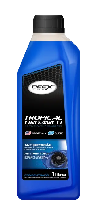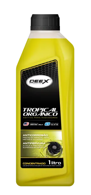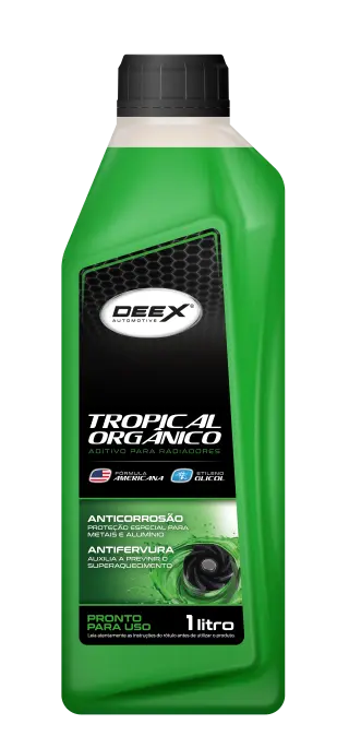 DEEX ADITIVO TROPICAL ORGÂNICO CONCENTRADO foi desenvolvido para países de clima tropical. Apresenta o mais avançado pacote de aditivos protetores de corrosão, testados nas mais severas condições de uso e em motores de alta performance. Sua composição foi balanceada para o ideal funcionamento de todo o sistema de arrefecimento. Contém os melhores e mais nobres aditivos para proteção de alumínio, aço, ferro e metais não ferrosos em geral, incluindo anticorrosivos, antiespumantes, anticavitação e, também, proteção extra para bomba d'água válvula termostática. Evita fervura e evaporação. Atende as normas ASTM D1384, ABNT NBR14261 (Teste de corrosão).